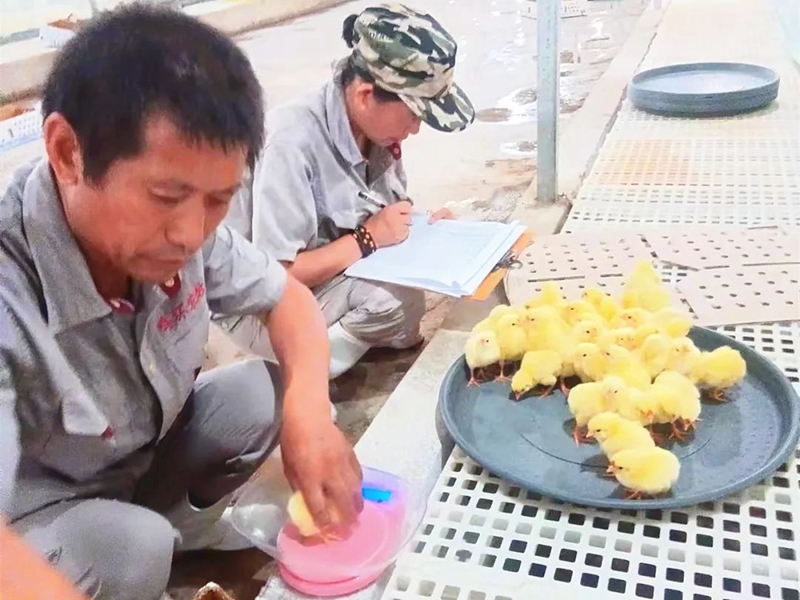 金雞入舍后,工作人員嚴格按照質量評估標準對雞苗進行綜合評估。